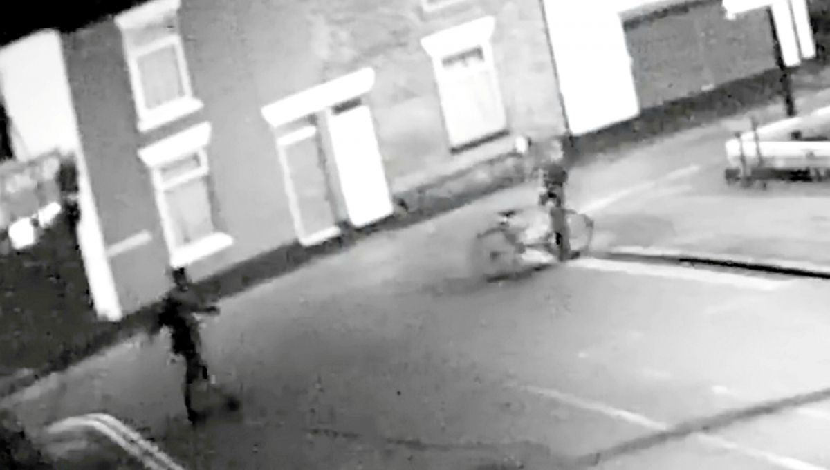 Shocking CCTV captured the moment the man approached his victim as she rode along Macklin Street, in Derby city centre last week.