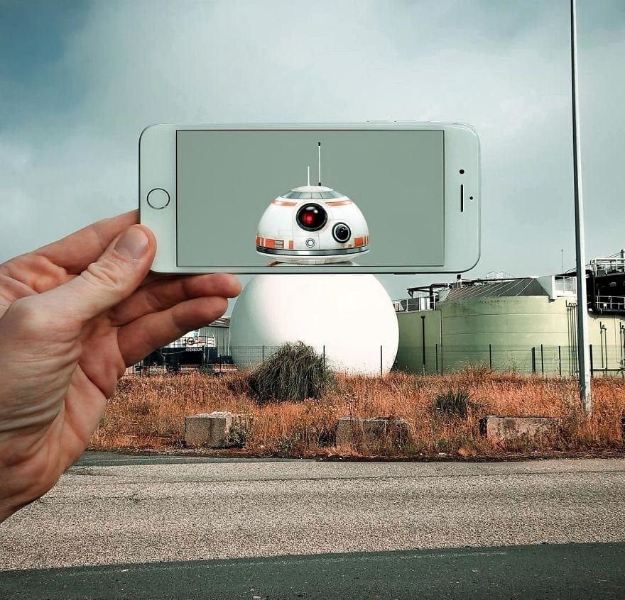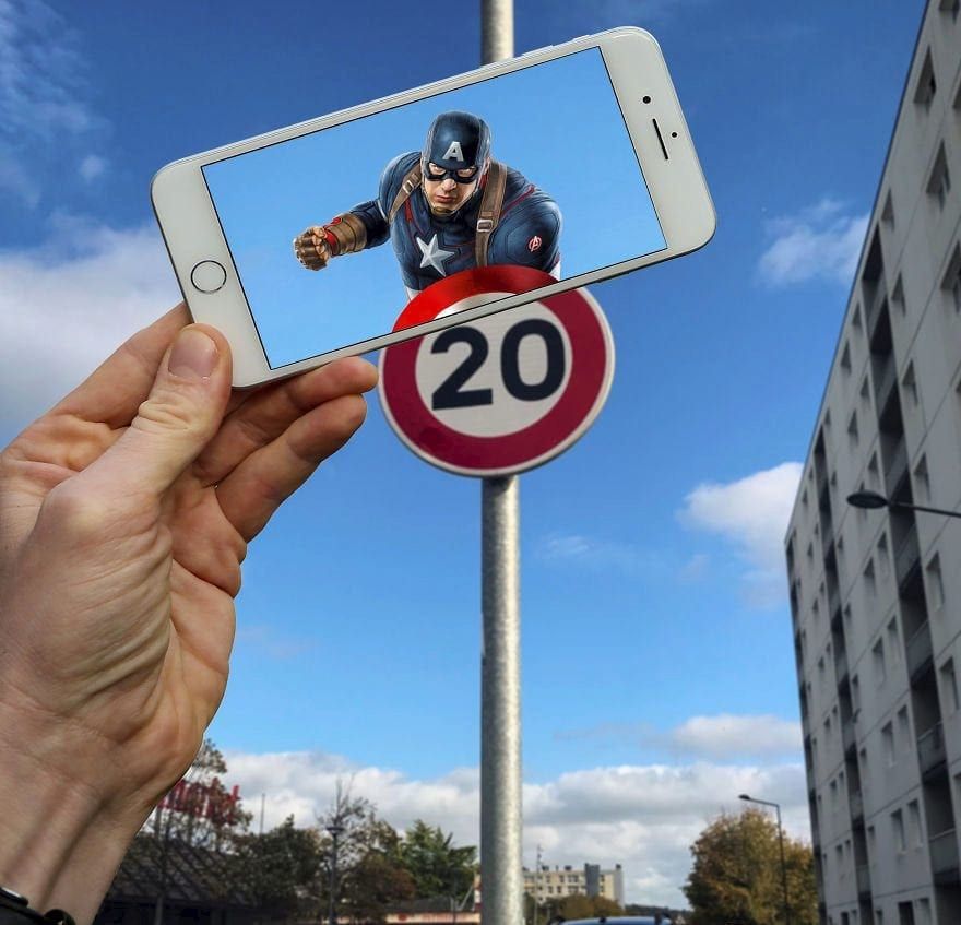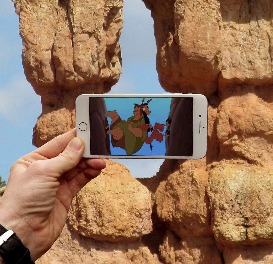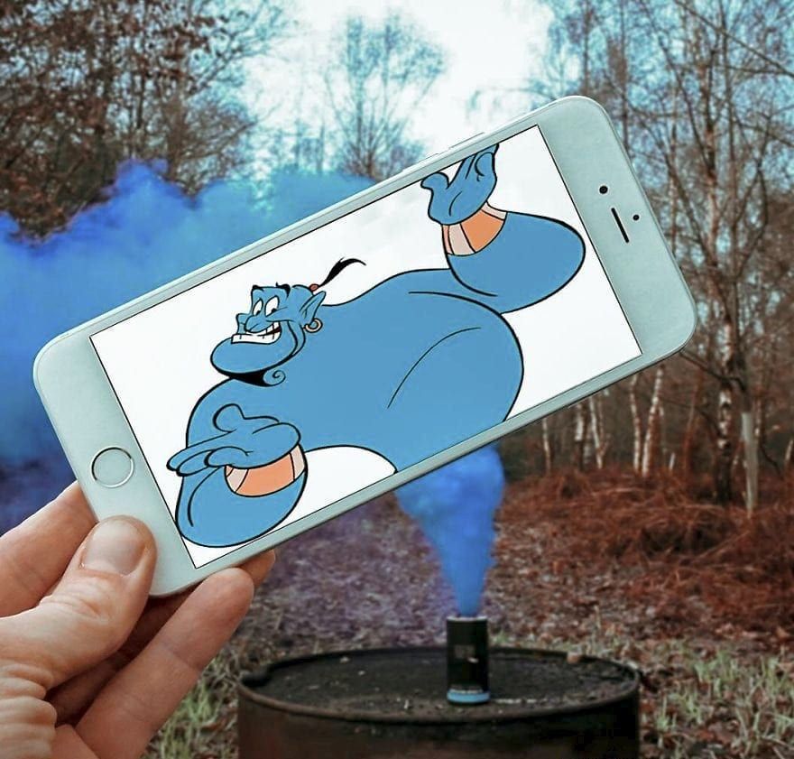 The technique involves holding up his Iphone with an image of a well known character over an every day object or a person and snapping the photo using his Sony A7III camera.