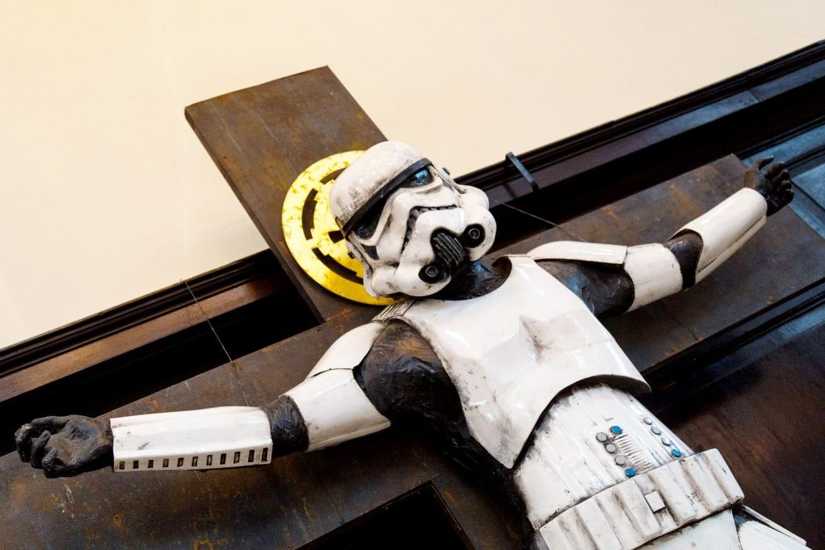 Artist Ryan Callanan created the controversial statue – that shows the original A New Hope imperial stormtrooper hanging on the life-sized cross.