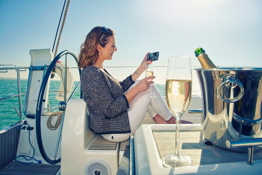 Model Sarah Brazier, 37, from Redfield, Bristol, streamed Riviera from a yacht in the English Channel while sipping a glass of champagne.