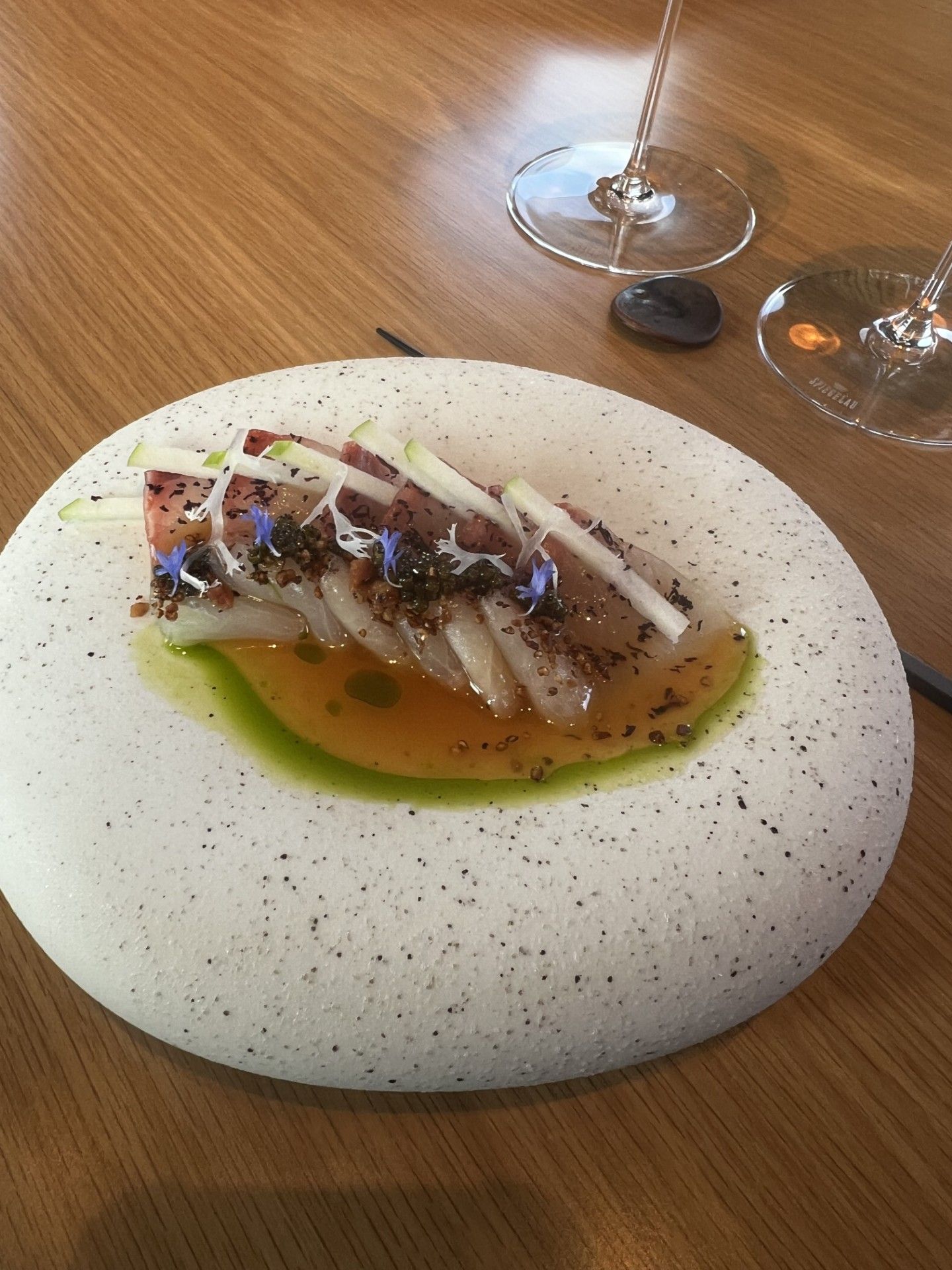 Luckily he was very much present at the lunch I attended, with a charm and playfulness which only made his dishes make more sense. At Kioku the idea is Japanese technique filtered through the Mediterranean. ‘Kioku’ means memories in Japanese. He also makes the point that this is fusion from the other end of the telescope to what we are accustomed. It is “Japanse first” fusion, in other words it begins with a Japanese dish or concept which is subtly and gently altered by a mediteranean element rather than being a western dish with asian flavours tacked on.