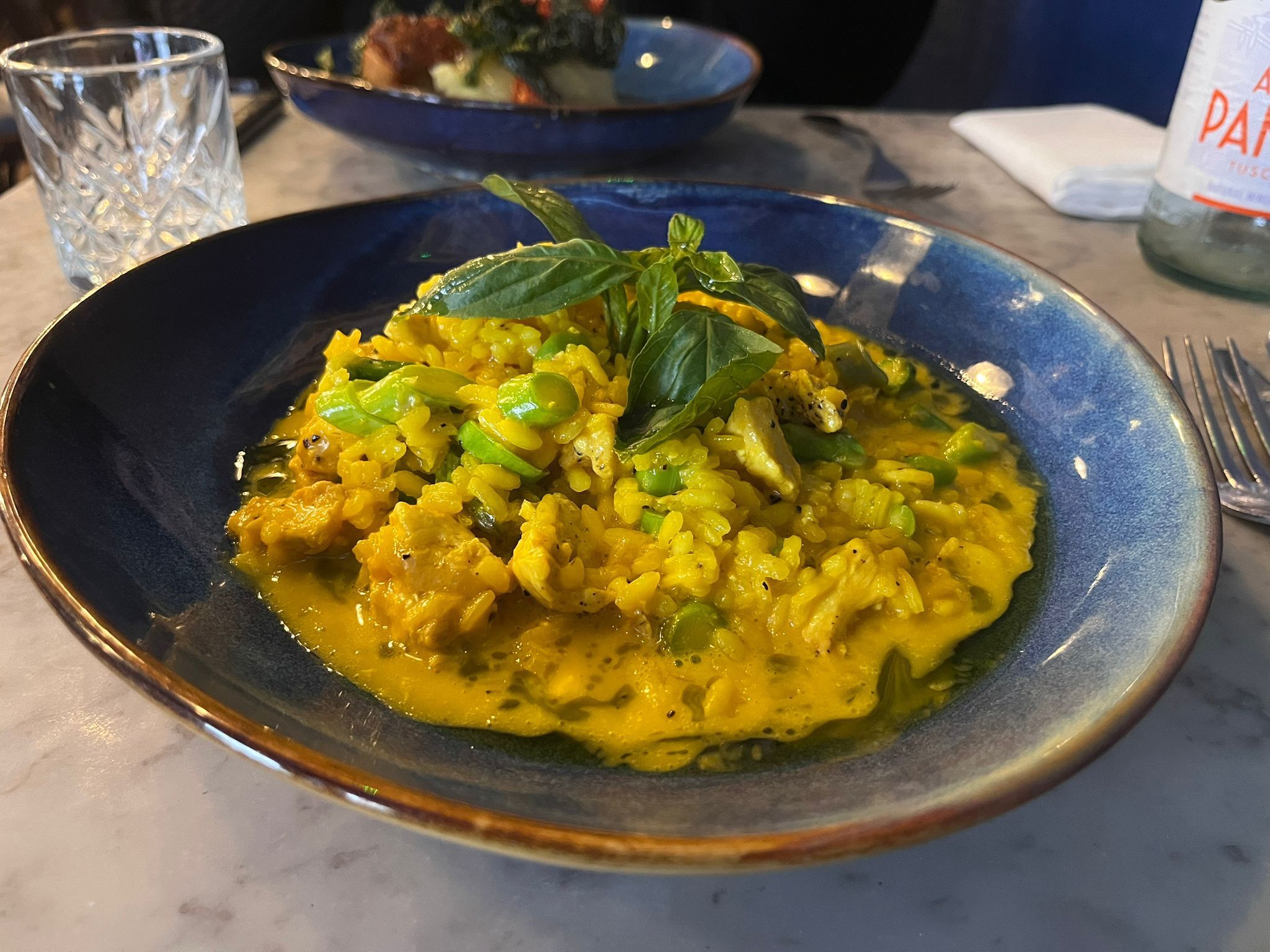 The chicken risotto with saffron and asparagus tips.