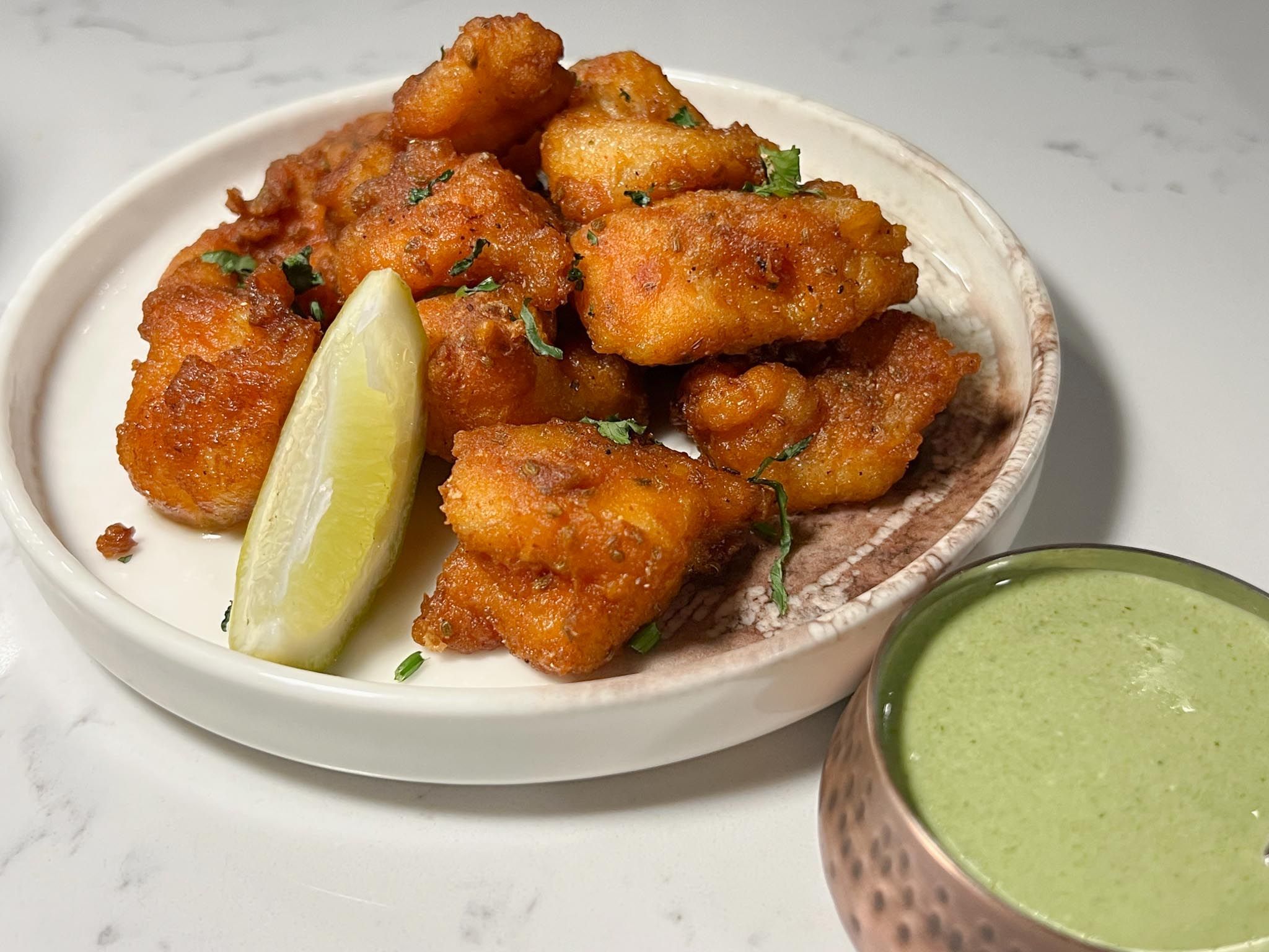 Fish Amritsari bites in a fine carom-spiced batter, literally dissolve with the first bite, served with a mint yoghurt. I insist you try these.