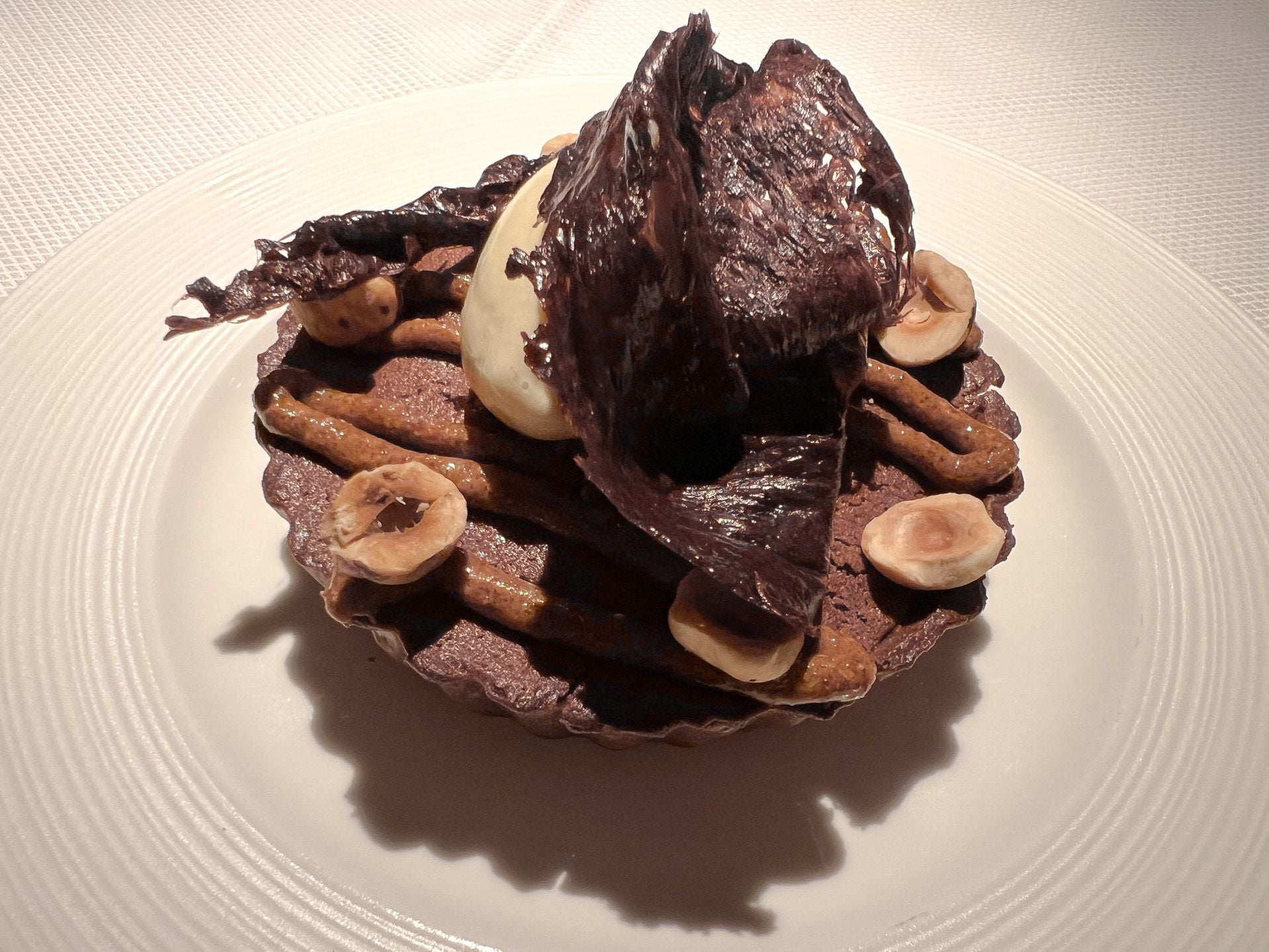 Dessert, La Russe Biarritz, is a Basque classic that plays with textures of sponge, praline and mousseline, though in the absence of it hitting a nostalgic note personally, it was outshone by the soufflé chocolat noir made with XOCO dark chocolate, soufflé tart, and a scoop of “Landes pine-bud” ice cream. Crisp, nutty chocolate, gooey and rich, this is a standout pud.
