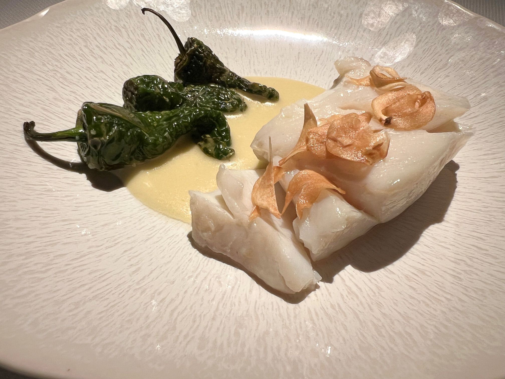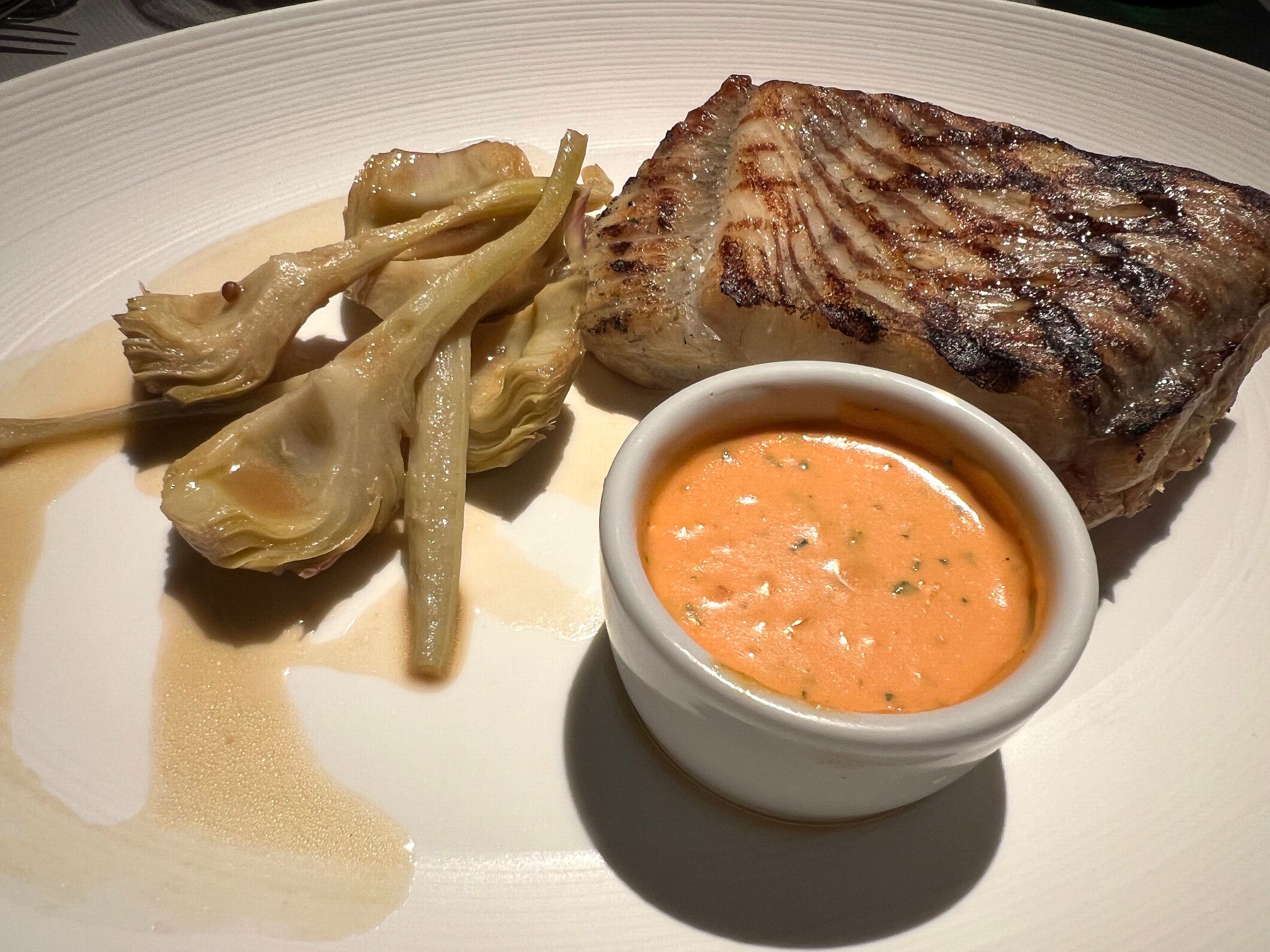Both our main courses were a triumph: slow-cooked cod with Basque pil-pil sauce was utter perfection. Gently heated in duck fat, the cod is served in an olive oil sauce of fine garlic slices and Padrón peppers. And the grilled turbot, Choron sauce and artichoke barigoule, arrived exactly as It should be, only just cooked in the middle, still translucent. It’s a large portion served with a side of whole artichokes.