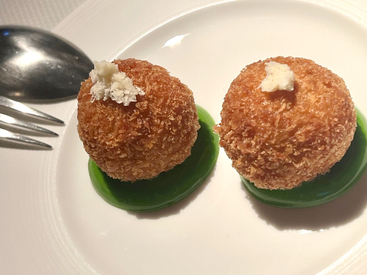 An hors d’œuvre, the smoked eel croquette with Comté cheese, lovage and horseradish was small and fab, our bouches suitably amused.