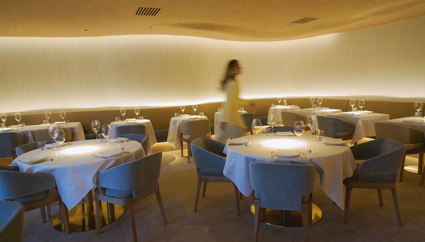 The space designed by NY practice Bolt Builds is ultra-simple, warm and monochrome, with an undulating ceiling as though one were underwater. Upholstery is a mix of desaturated ice cream colours. Gentle washes of light punctuated by the sharpest of spotlights onto each table make everything sparkle and faces glow. And a splash of contrast is added by the clientele, dressed predominantly in black.