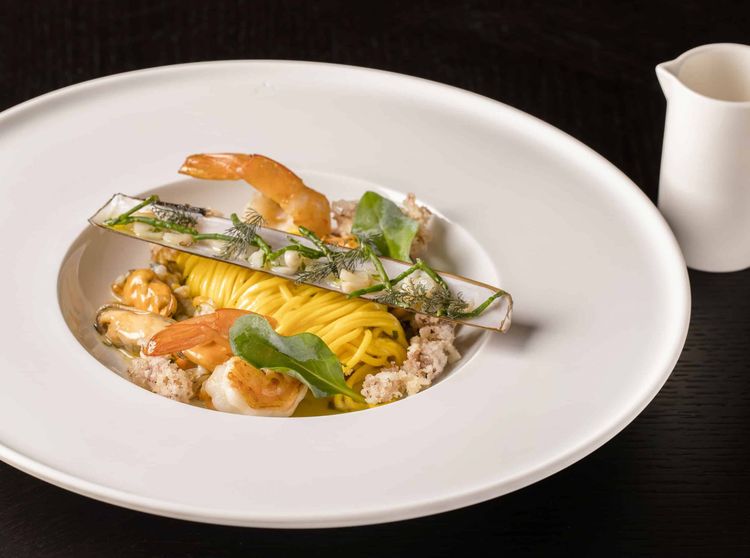 Split into four key spaces, the large restaurant seems to suffer a bit of an identity crisis, with a disconnect running throughout the dining rooms. Otherwise, the space is festooned with dark wood accents, comfortable seats, flashes of gold and various art deco nods, low-lit at dinner while clubby lounge music plays. A covered terrace is also on hand, while servers are extremely professional in a manner typical of Jason Atherton’s restaurants: well-groomed, impeccably dressed and happy to explain various dishes and make recommendations from the relatively long menu.