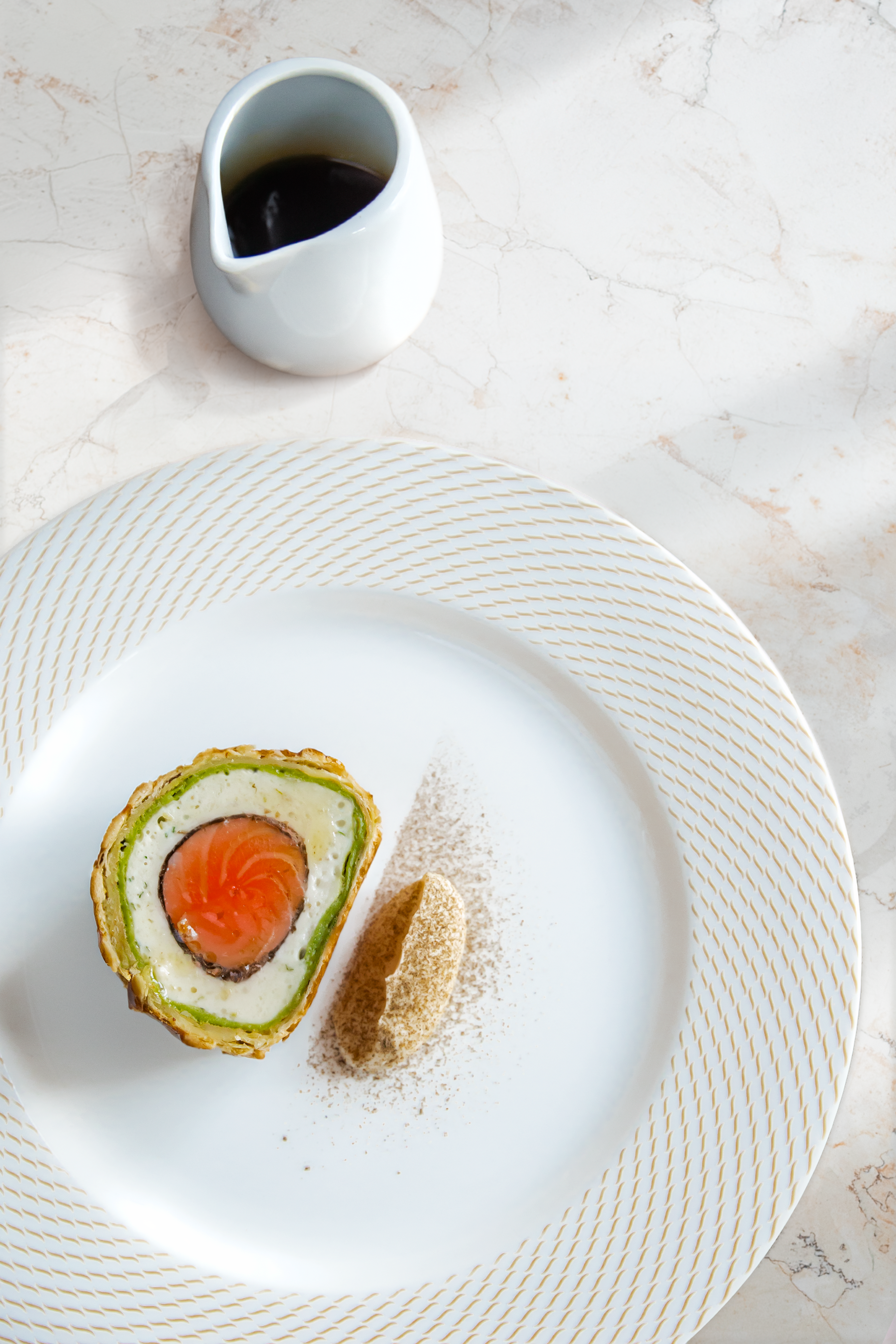 The main courses offered similar riches, with a very tempting curried monkfish with kohlrabi bajii and kaffir lime yoghurt (£38) and what can only be described as proper fish and chips for a most reasonable £29.50. I was tempted, as ever, by halibut (possibly the greatest of all fish?), but in the end we could not resist going for the of-the-moment salmon wellington for two with celeriac puree (and I love celeriac puree) and fish jus. We were very pleased we did firm but flaky pastry giving was to pink flesh that flaked as you would want it. And for only £75 for two.