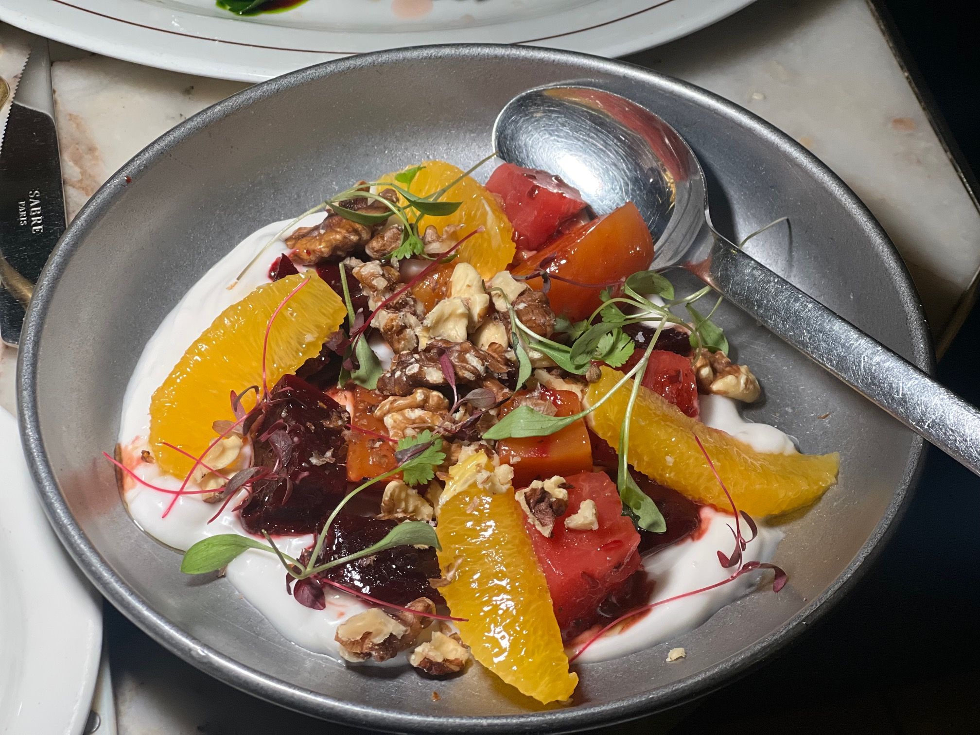 In the hope of a clean vegetable side dish be ordered beetroot, coconut labneh, orange and walnuts but its labneh sauce denied it of its fresh acidity.