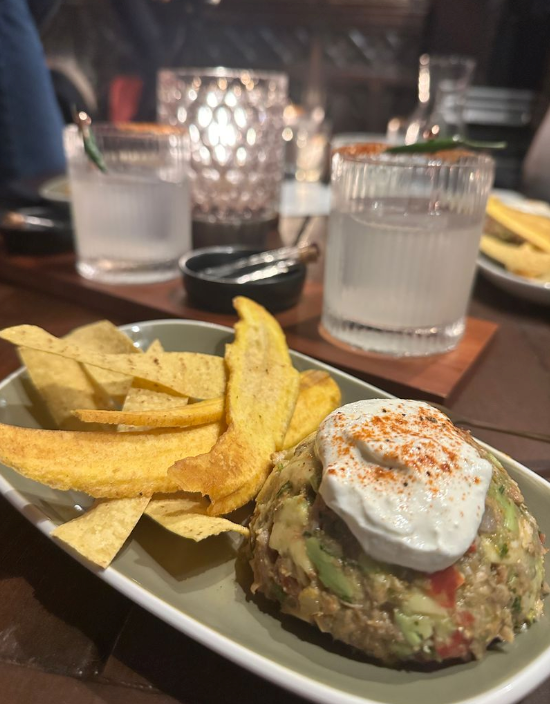 Track 3: Spicy Margarita with Pork Tostada topped with lime crema and served with plantain and corn chips