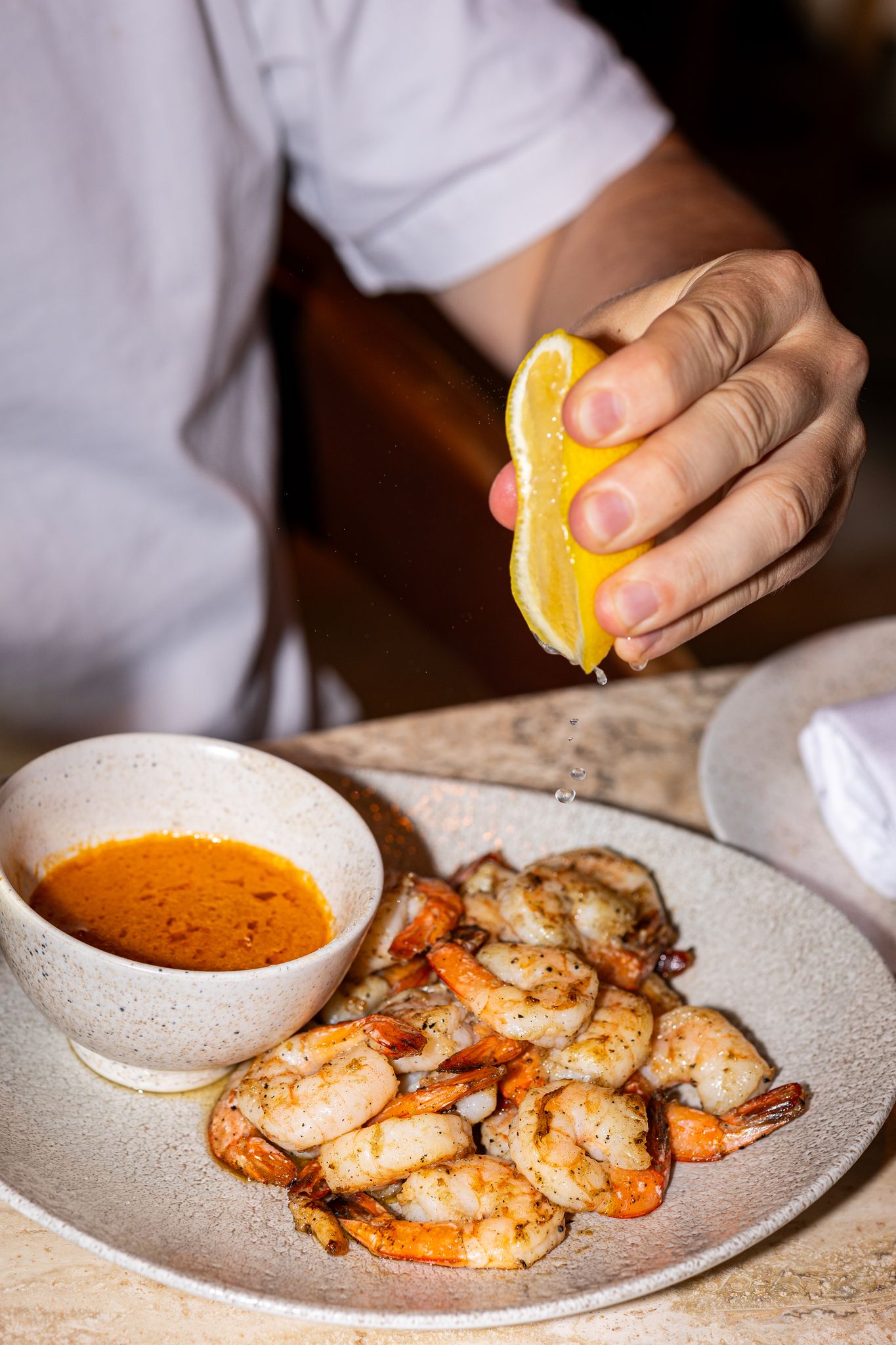 The prawns have been vacuum-packed with garlic for a bit, then flame-grilled, giving a succulent smoky flavour. They’re dressed in lime powder, paprika, and chilli, which cut through the smoke and brighten the sensation. Delicious.
