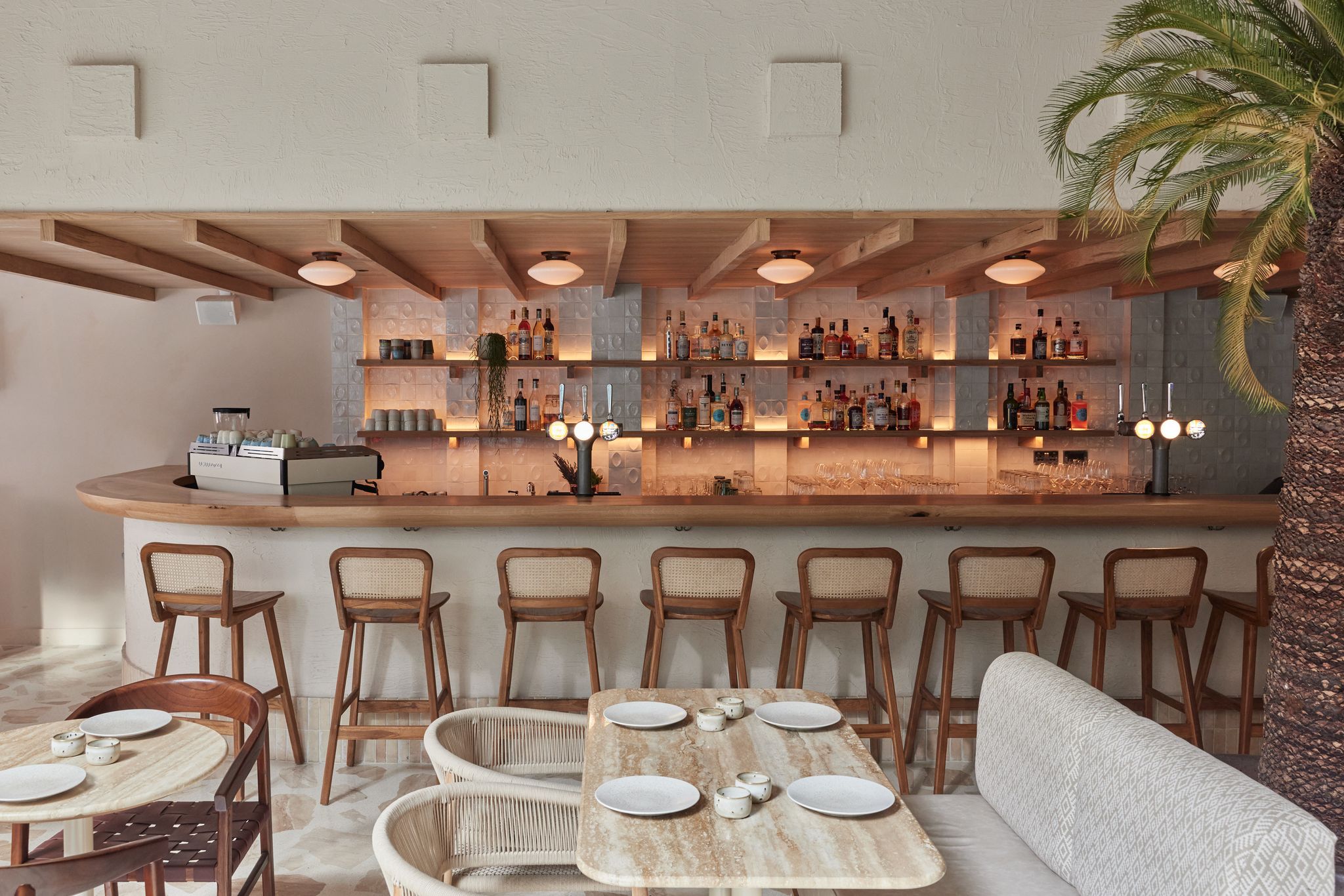 Aquamarine seashell designs cover acres of wall. Creamy paint and dark wood timbers conjure elegant bistros in sunnier corners of the world; those smart beach bars in Cannes, Miami, Athens, Dubai, or… Sydney.