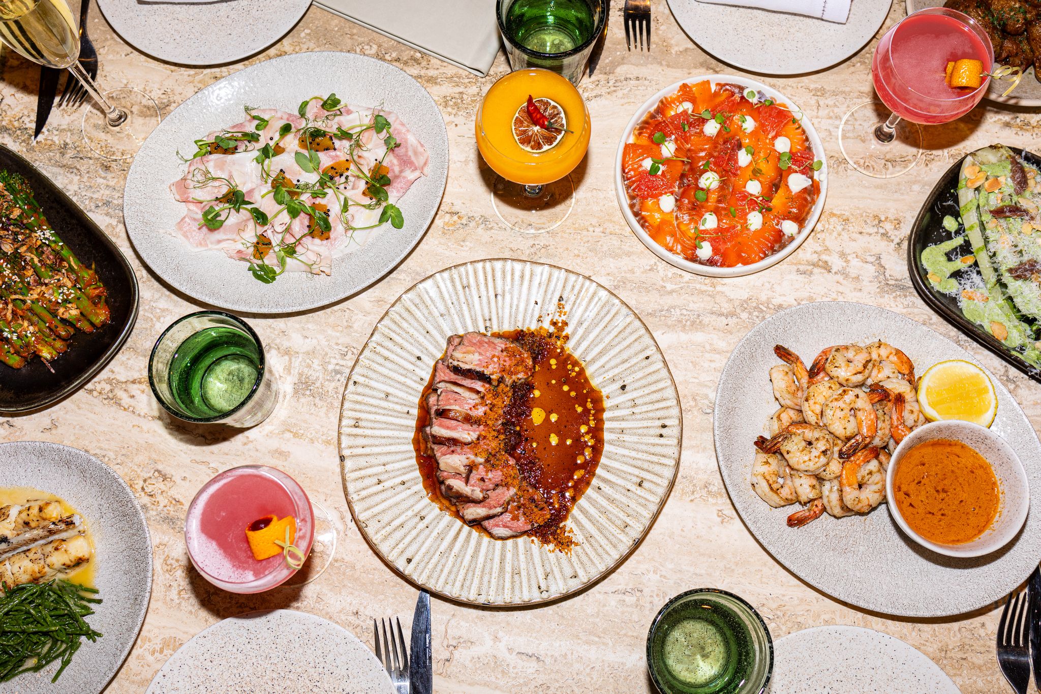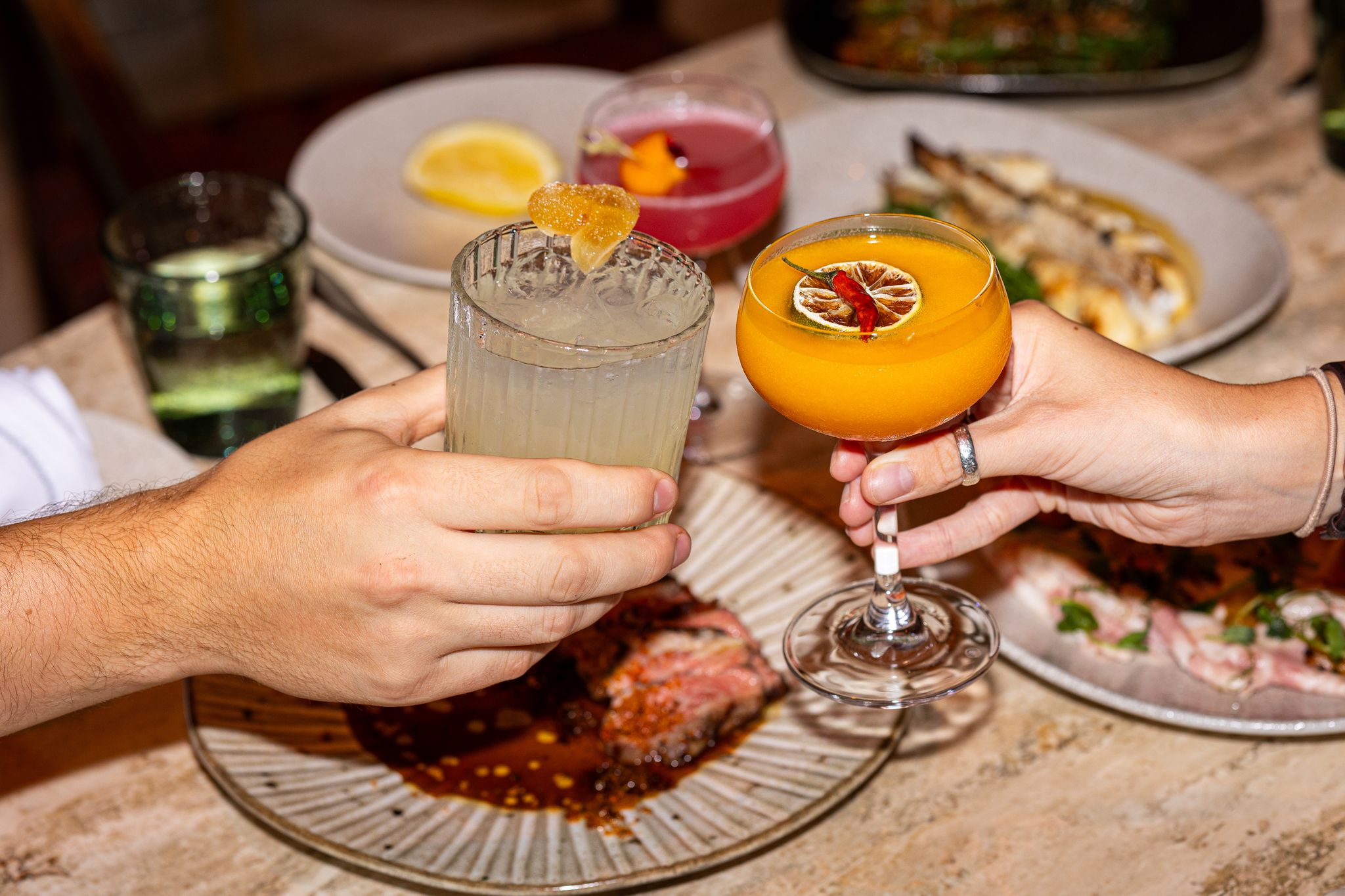 I order a mango chilli margarita. The tanned server eyes my Atlantic-beach-rain complexion and warns me it’s quite spicy. I say, bring it on. They’re right. And so was my choice. Mezcal and Campari layered through sweet mango nectar, with a snap at the back of the throat from the chilli. It’s spicy and it’s ace. My guest has the Papa Salt Paloma; basically gin, pink grapefruit and soda — with a rosemary twig dunked in. A bold choice; setting up the barbecue flavours, perhaps? It does the job, though not as much fun as my chilli-mango adventure.