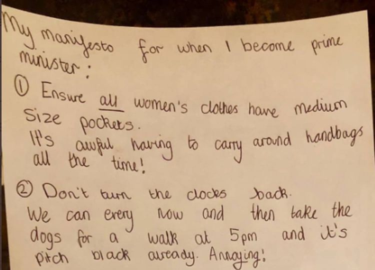 Entitled “My manifesto for when I become Prime Minister”, his 9 year-old daughter set out a platform campaigning for medium size pockets in all women’s clothes and a pledge to send a woman to the moon.