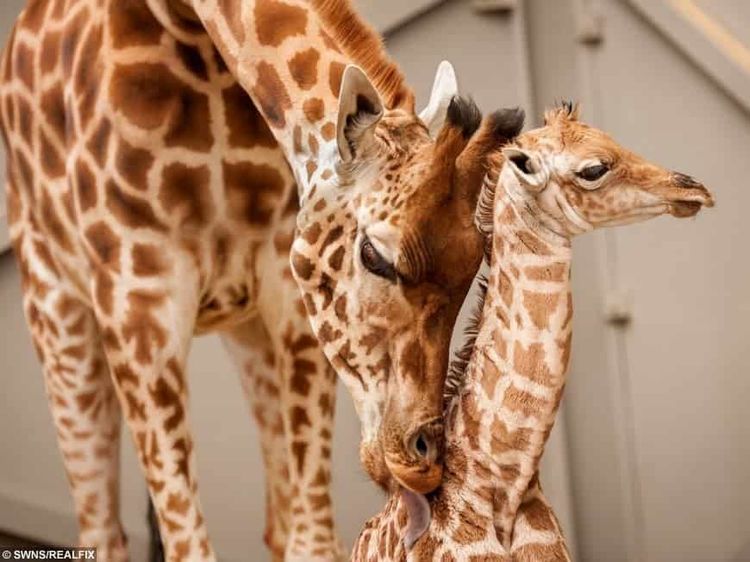 This new mum sticks her neck out to care for her newborn baby giraffe, who proudly poses for the camera while being pictured for the first time.