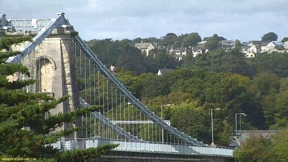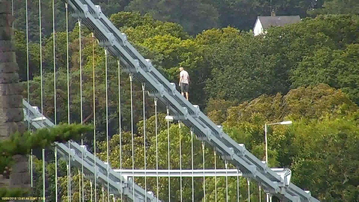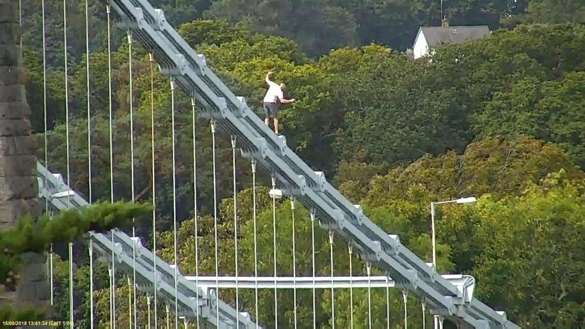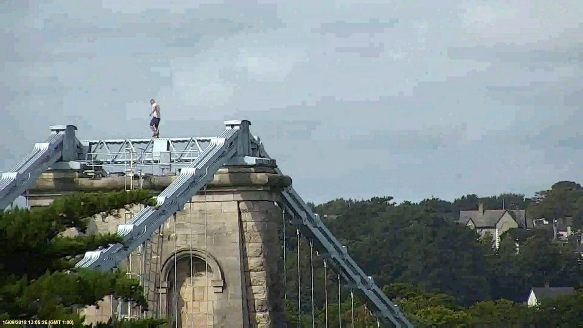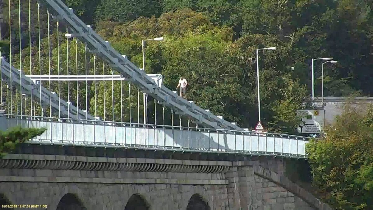 Video footage captures Craig Lee Jones, 31, walking along the railings to the highest point of the Menai Suspension Bridge, where he remained for an hour.