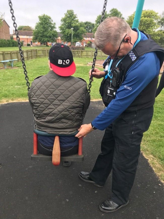 He was firmly wedged for more than three hours until police and fire crews were called to rescue him from the swing in Landseer Park, Ipswich, Suffolk.