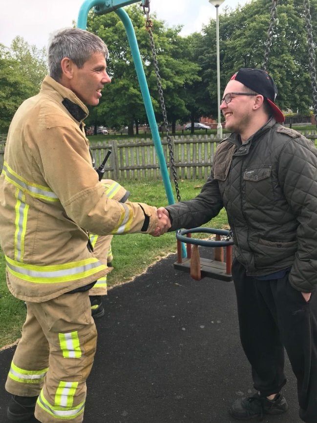 This is the incredibly awkward moment a 20-year-old man had to be freed by firefighters after getting stuck – in a child’s swing.