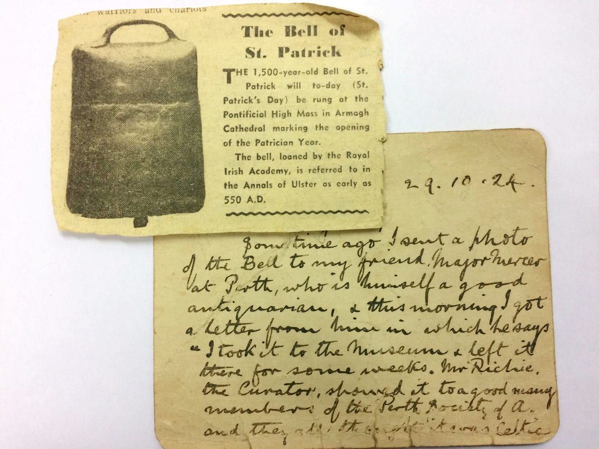 The note, dated October 29, 1924, described it as being of Celtic origin, about 1,500 years old with a handle “not at all like a cow bell”.