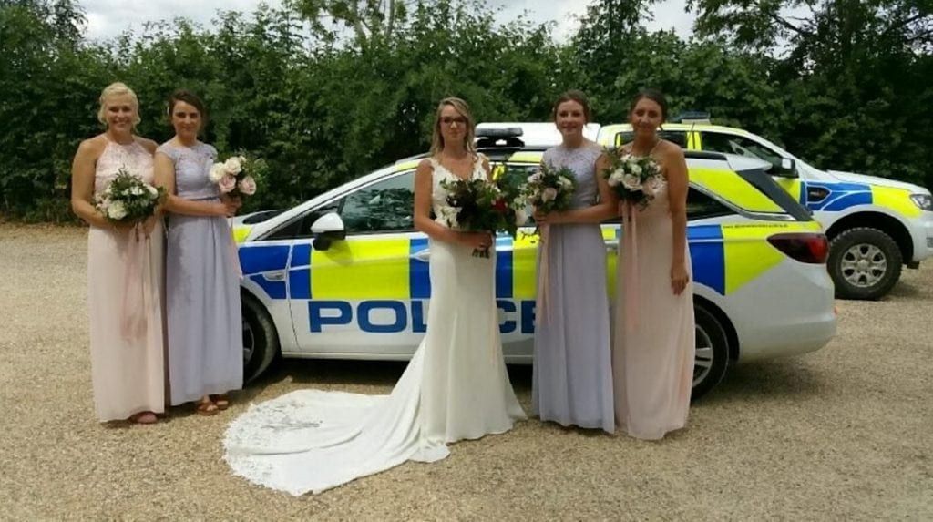 The kind-hearted officers gave the bridal party a lift to nearby Cripps Barn, Cirencester, Glos, and Chloe got to her wedding on time.