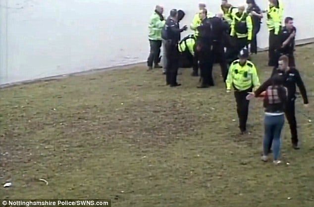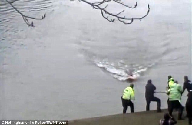 PC James Patterson, a qualified lifesaver who swims for the GB police swim team, leapt into action to save the man after he fell into the River Trent in Nottingham.
