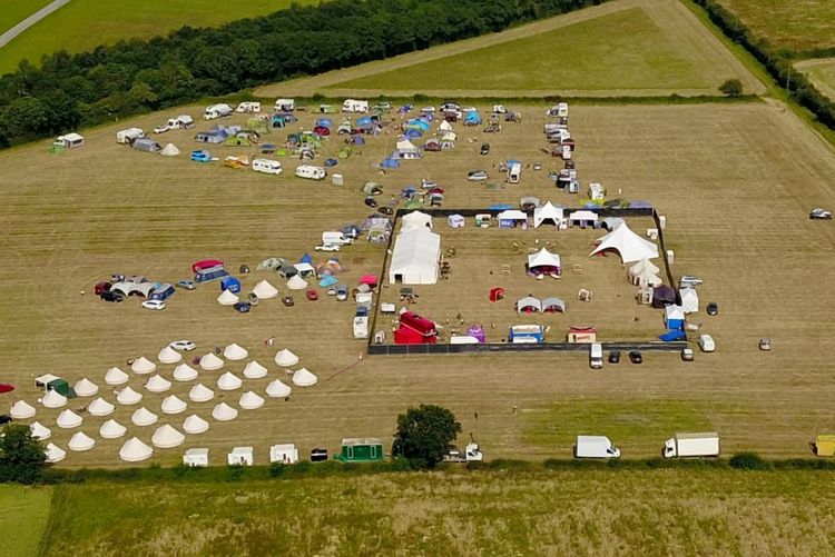 Drone pictures of the field near the Three Counties Showground – opened by the Queen in 1958 – show a red double-decker party bus and gazebo covering several double-beds.
