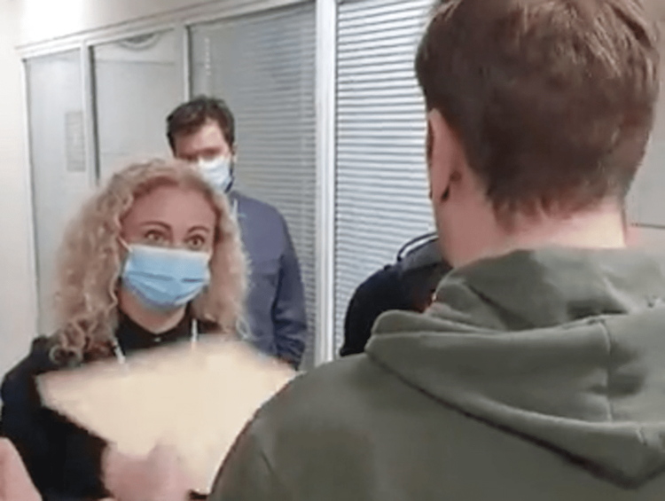 Conspiracy theorists hand a female NHS medic several large brown envelopes, including one containing “all the evidence to prove that coronavirus is an absolute plandemic hoax”.