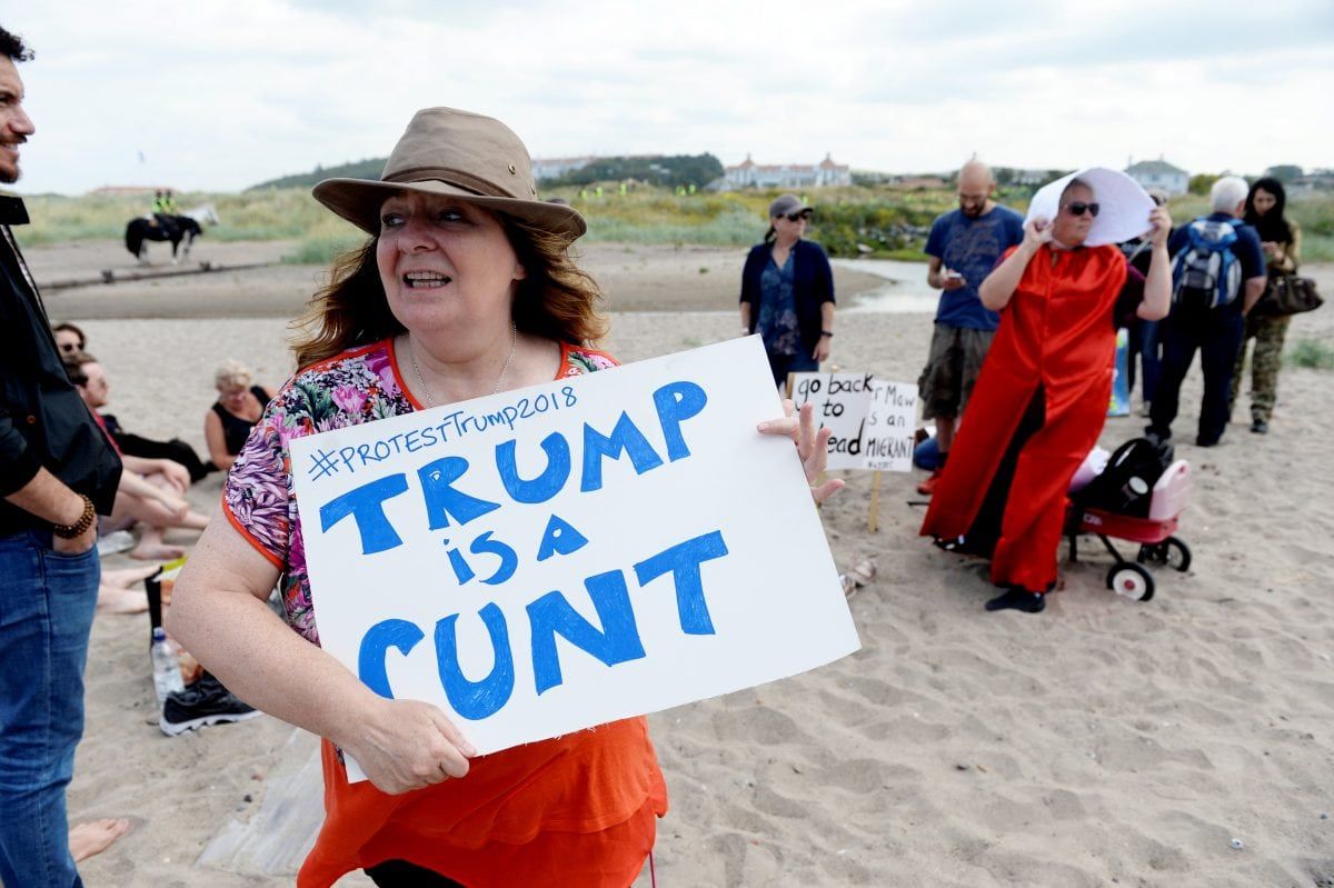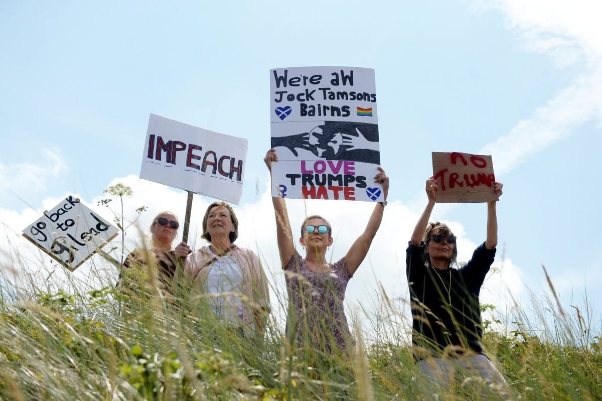 Trump’s visit last year was greeted by hundreds of thousands of protestors in London – as well as a giant inflatable baby Trump blimp – , demonstrations in Edinburgh and interrupting a round of golf at his Turnberry resort.