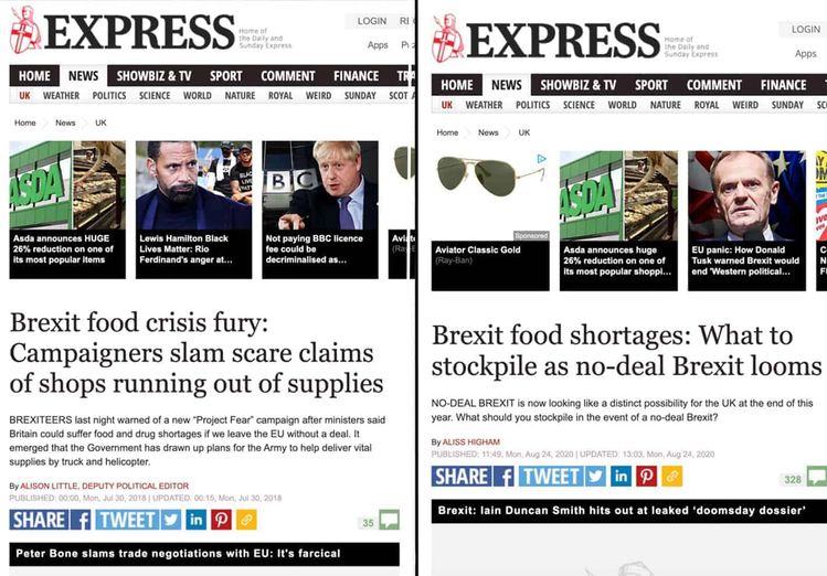 At the end of July 2018 the right wing tabloid reported on a new “Project Fear” campaign after ministers said Britain could suffer food and drug shortages if we leave the EU without a deal.