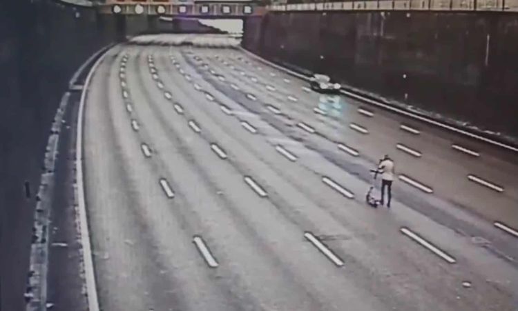 At one stage in the video, released on Friday by the Central Motorway Police Group (CMPG), the individual also appears to start walking the scooter along the middle of the seven-lane carriageway as cars zoom past at up to 50mph.