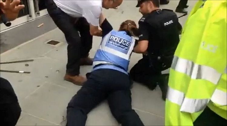 The PCSO was sent sprawling onto the pavement while officers struggled to keep members of the far right group away from rival protesters.