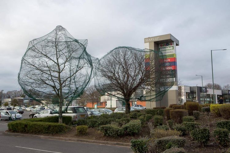 Residents and environmental campaigners are outraged after huge plastic nets have been placed on trees to stop birds nesting at a retail park.