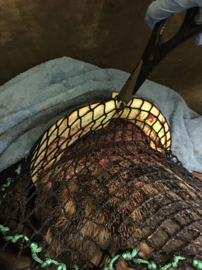 Frisbee had been stuck in a tight yellow plastic ring that sliced through several inches of blubber as she moved about.