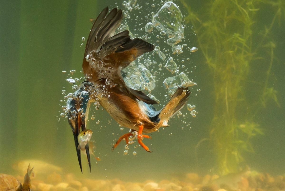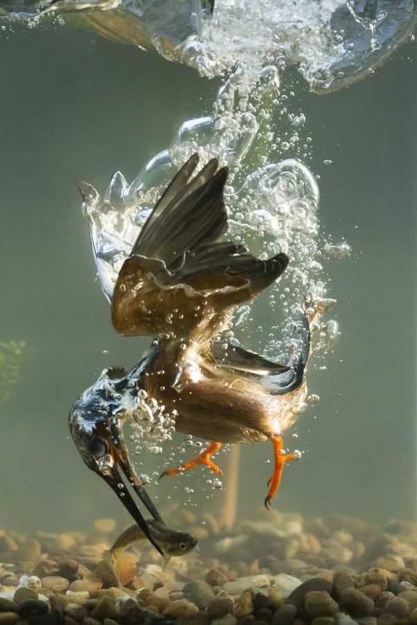 In this stunning sequence, the kingfisher can be seen piercing the surface of the water after spotting a fish on the river bed.