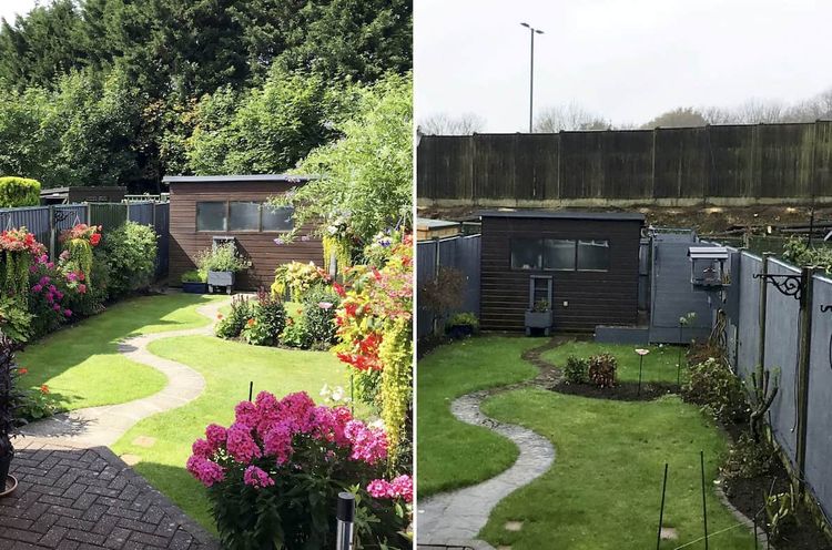 Shocking before and after pictures show one garden bursting with colour surrounded by lush green trees which has now been left with barren views of the motorway.