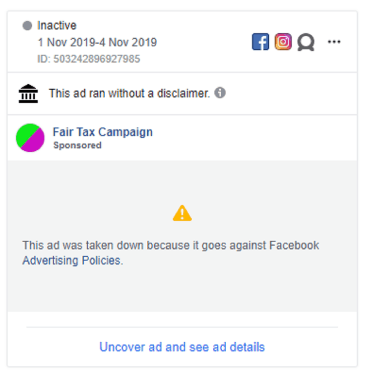 After the Fair Tax Campaign ad was removed, Conservative Damian Collins, who chaired the DCMS sub-committee, tweeted: “First strike in the campaign against sketchy political ads on Facebook.