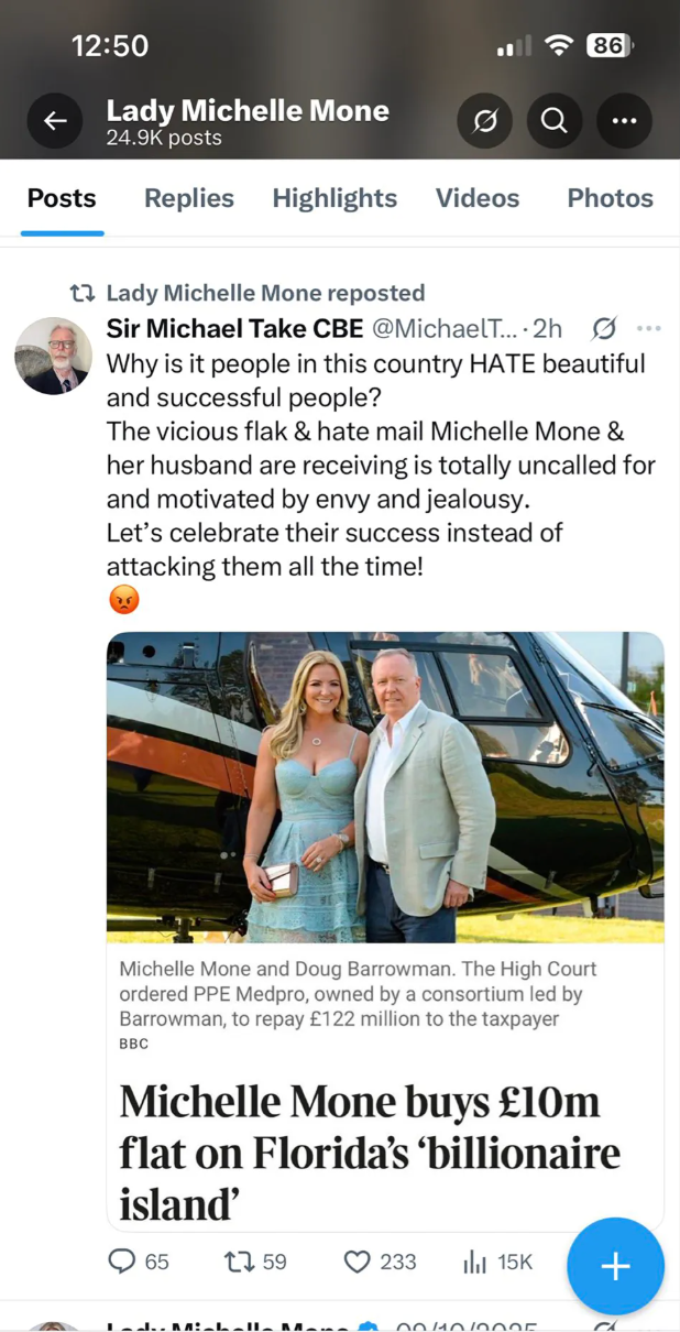 In a post, he mockingly wrote about Mone: “Why is it people in this country HATE beautiful and successful people? The vicious flak and hate mail Michelle Mone and her husband are receiving is totally uncalled for and motivated by envy and jealousy.