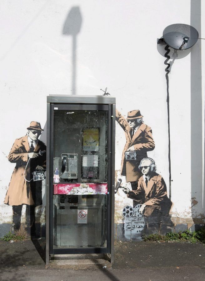 The elusive artist created ‘spy booth’ depicting three ‘spooks’ snooping on a phone box with listening devices near GCHQ in Cheltenham, Glos., in 2014.