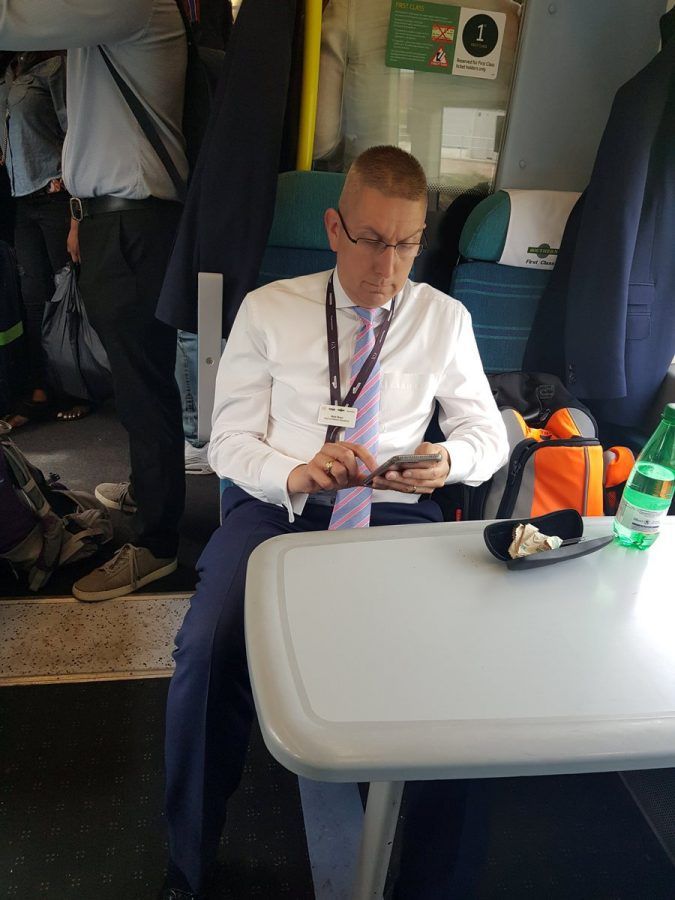 A commuter claims this picture shows a Southern Rail boss taking up TWO seats in first class on a packed train – after preventing economy passengers from entering the carriage.