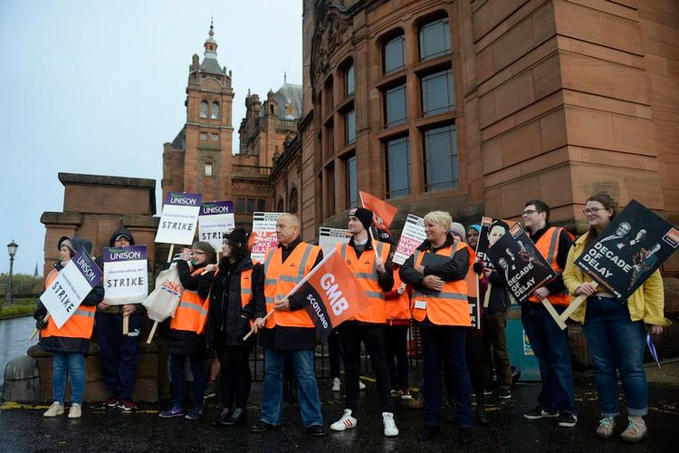The strike began at 7:00am on Tuesday, with protesters planning to gather at Glasgow Green before marching to George Square at noon to protest outside the City Chambers.