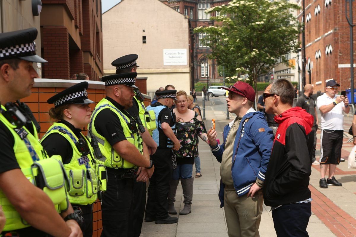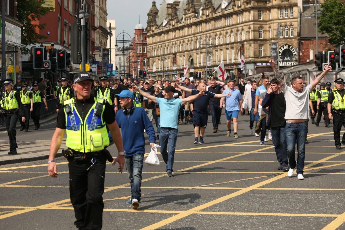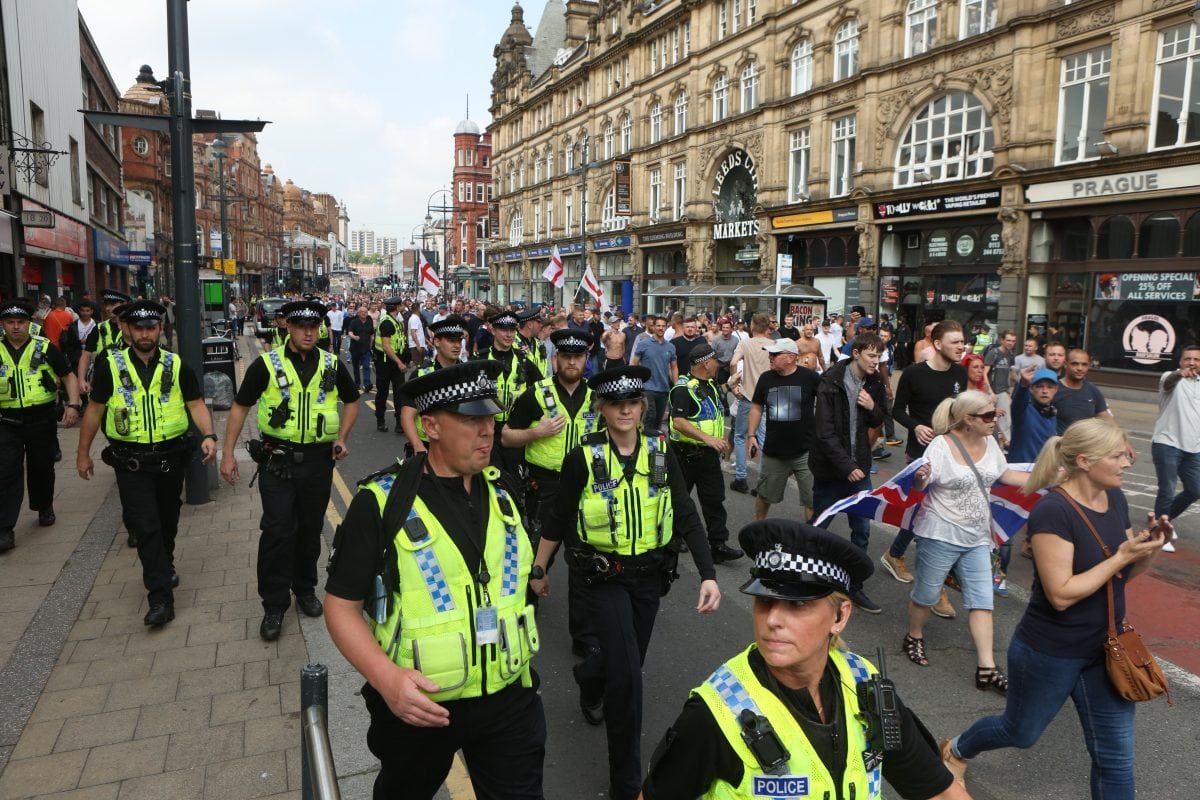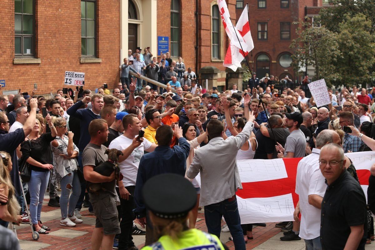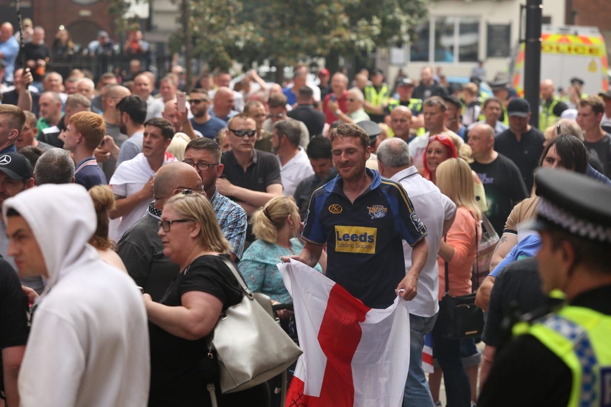 None of this deterred 400 followers of the far right activist marching on Leeds Crown Court, West Yorkshire, to voice their support.