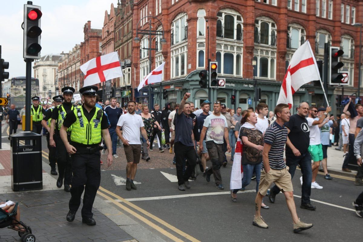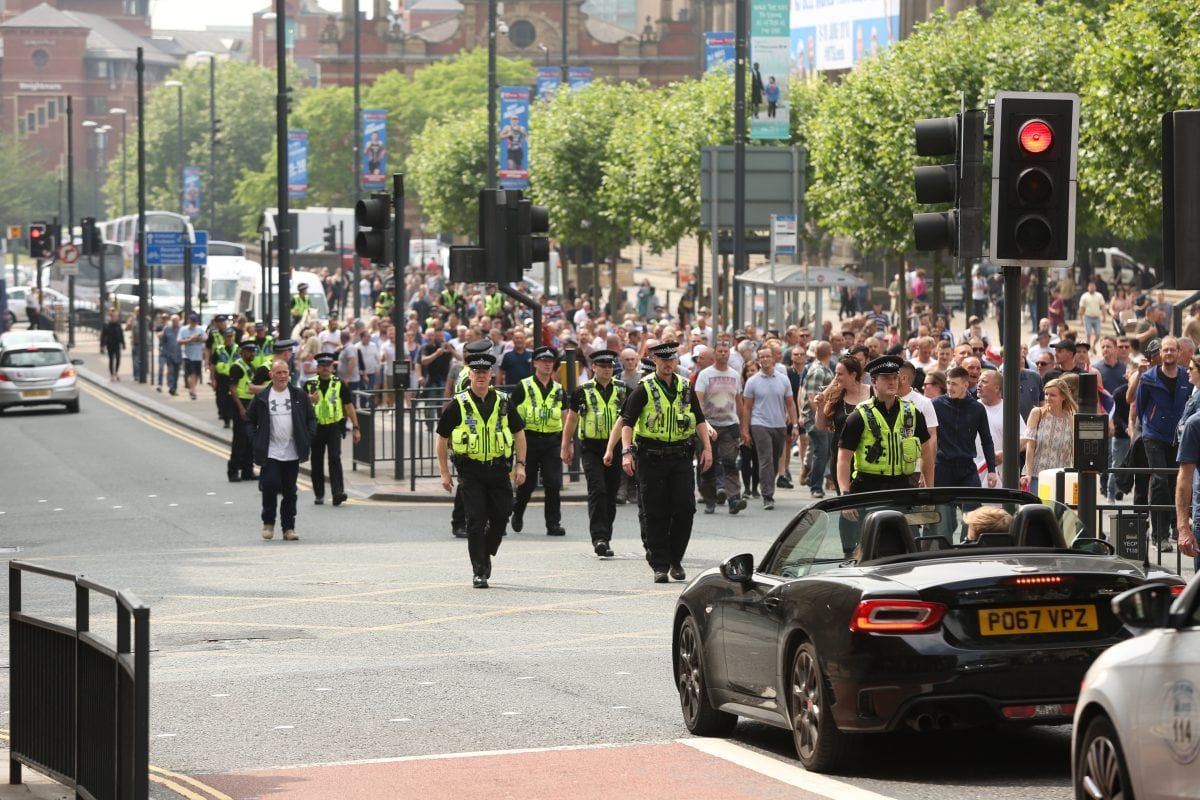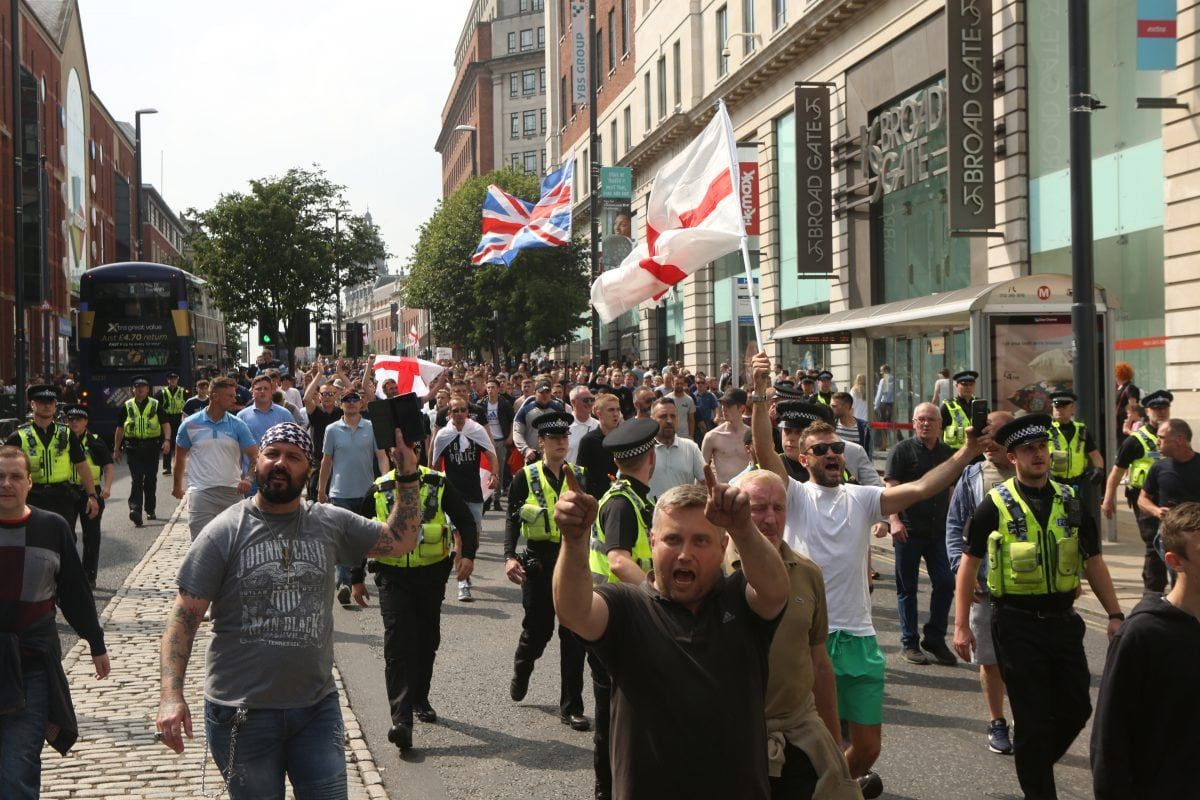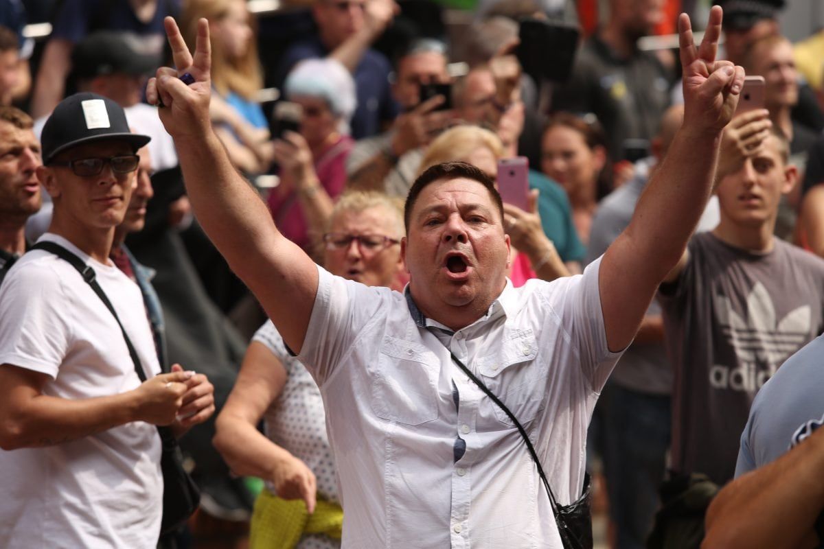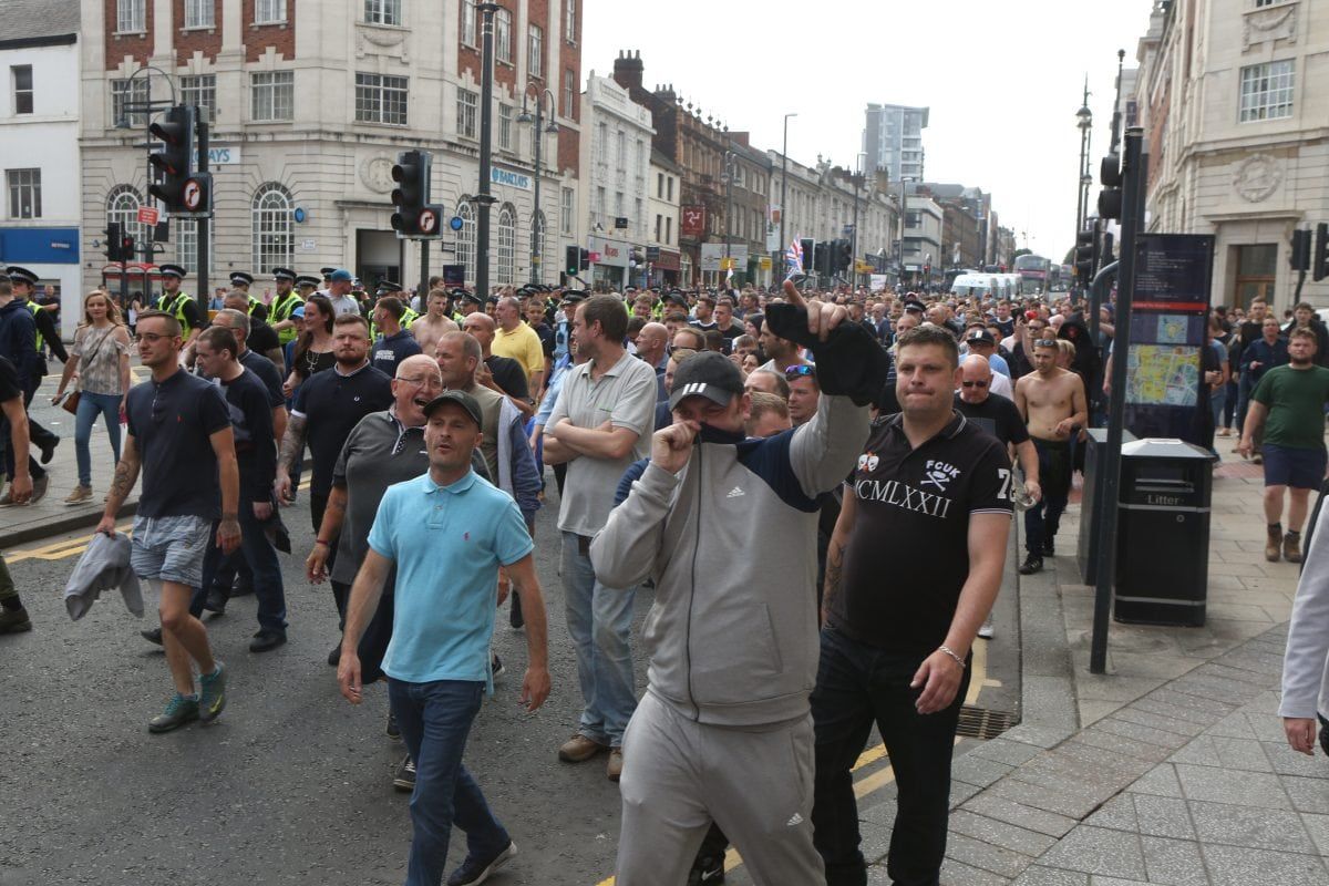 None of this deterred 400 followers of the far right activist marching on Leeds Crown Court, West Yorkshire, to voice their support.