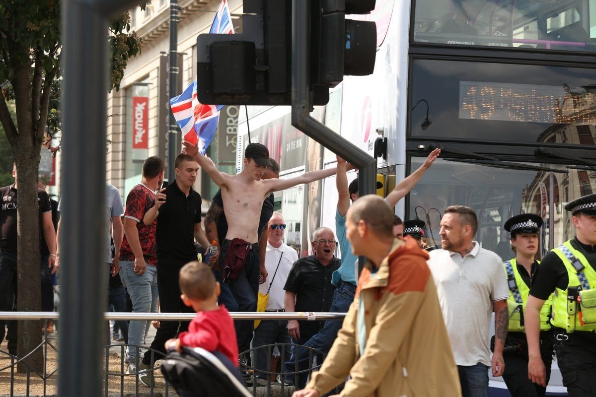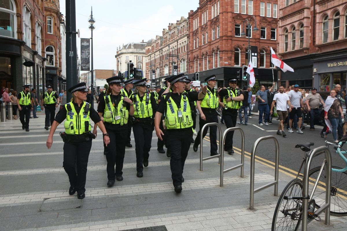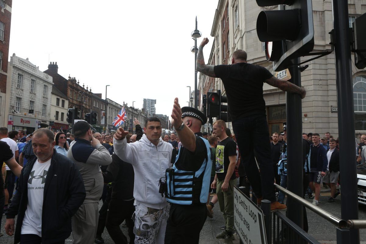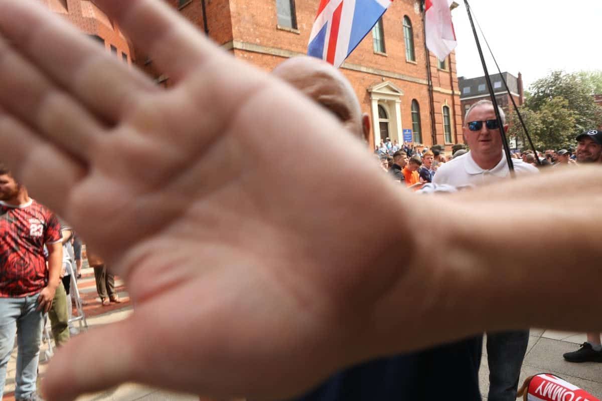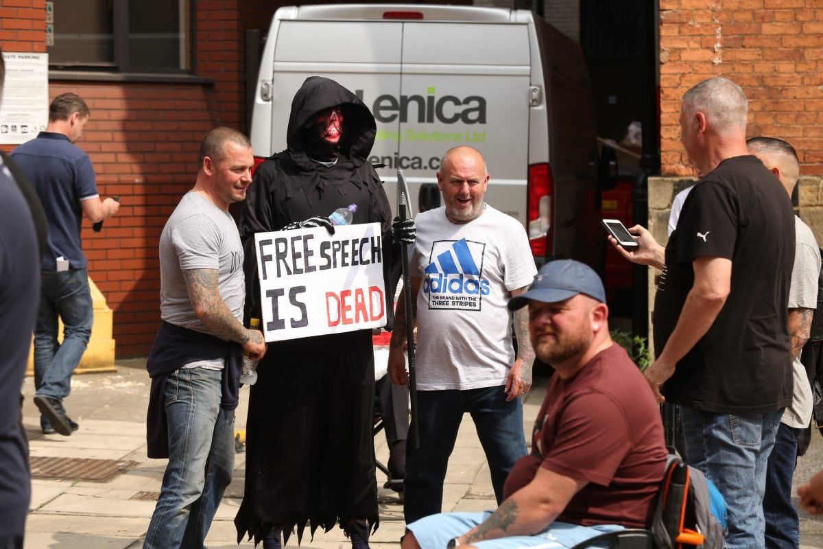 None of this deterred 400 followers of the far right activist marching on Leeds Crown Court, West Yorkshire, to voice their support.