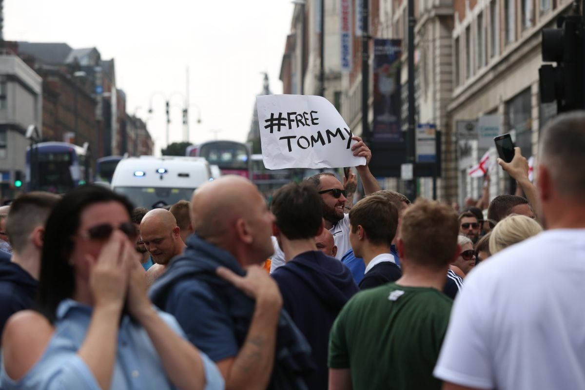 One home-made banner read ‘Free the truth teller. Free Tommy’.