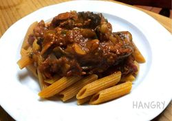 Bacon and Mushroom Arrabbiata with Lentil Penne Pasta