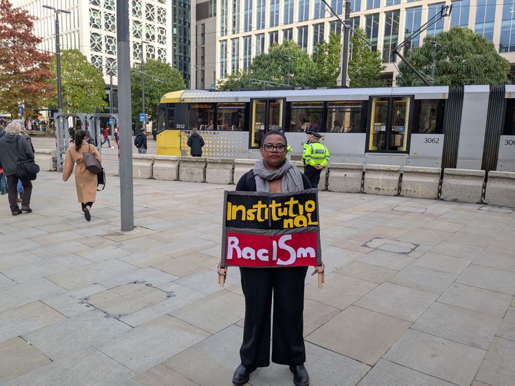 Her sign, “Institutional Racism”, wobbles slightly in the wind amid the (primarily) white, southern and male wave of Tory members leaving the secure zone.