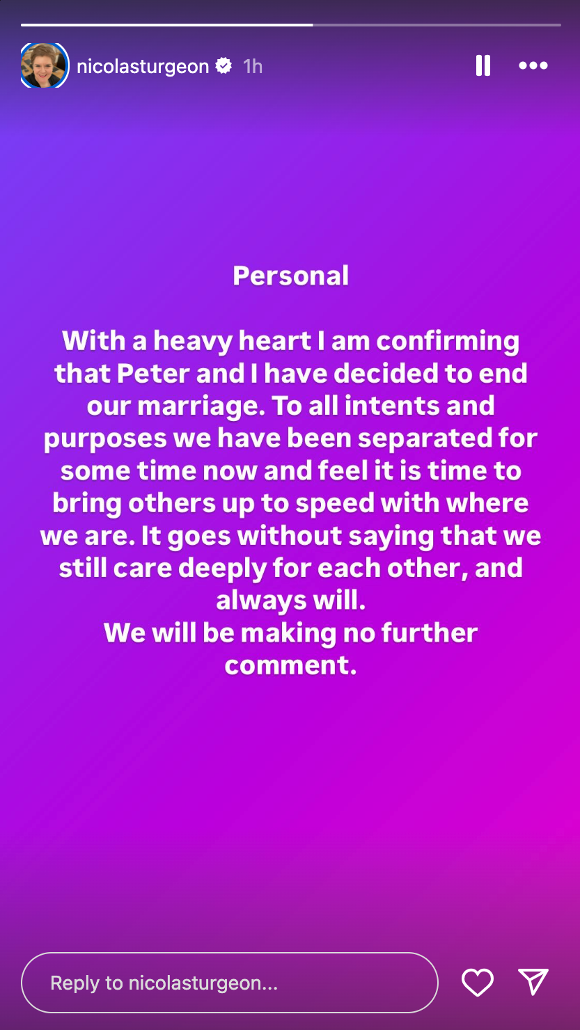 Posting on Instagram, Sturgeon wrote: “To all intents and purposes we have been separated for some time now and feel it is time to bring others up to speed with where we are.