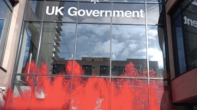 A fire extinguisher full of red paint was used to spray the front of the building and water balloons containing red paint were thrown at the UK Government crest.