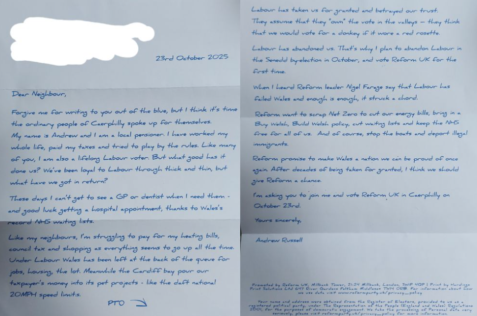 It’s worth noting that Reform also legally employed this tactic during the Caerphilly by-election in October 2025, using the perspective of local pensioner Andrew Russell. However, on this occasion, Reform did include their name – even if it was right at the bottom of the second page.